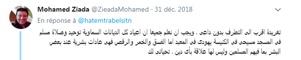 و في تغريدة ثانية على حسابه على تويتر أكّد حاتم الطرابلسي ان هذه الاعياد “هي شرك و معصية و فسق و خمر و رقص و فجور”