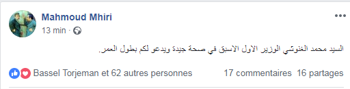 نفى المستشار الأول السابق لدى رئيس الجمهورية محمود المهيري منذ قليل في تدوينة على صفحته الرسمية على الفايسبوك ، خبر وفاة الوزير الأول الأسبق محمد الغنوشي.