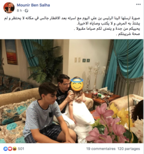 و في وقت سابق ، نشر منير بن صالحة، محامي بن علي، نفس الصورة على حسابه الخاص على الفايسبوك والذي أكد أن الأخير “بصحة جيدة وليس في غيبوبة ولا هو على فراش الموت”.