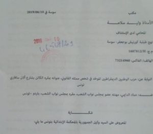 قدّم اليوم الاثنين المحامي وعضو اللجنة المركزية بحزب الوطنيين الديمقراطيين الموحد وليد سلامة، شكاية بالنيابة عن الحزب ضدّ النائب بمجلس نوّاب الشعب عماد الدايمي.