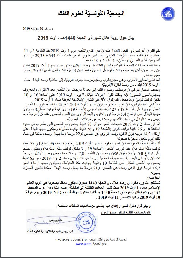 و كشفت الجمعية أن رصد هلال شهر ذي الحجة 1440 هجري سيكون ممكنا بصعوبة في غرب العالم الإسلامي مساء 1 أوت 2019 وتشير المعايير الفلكية إلى إمكانية رصده ابتداء من غرب المحيط الهندي.