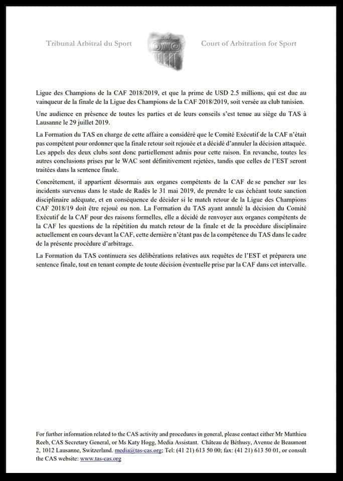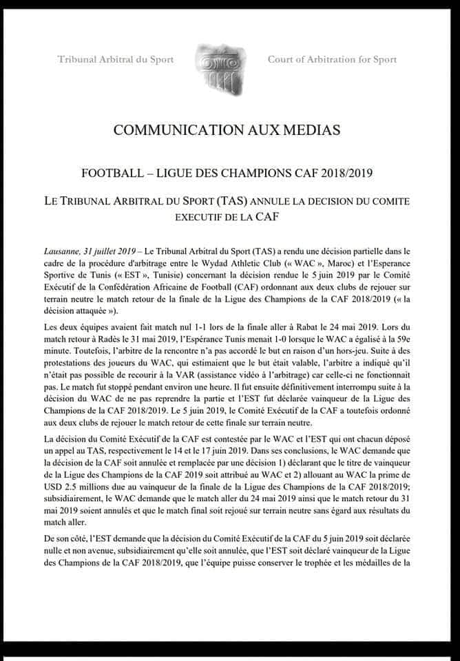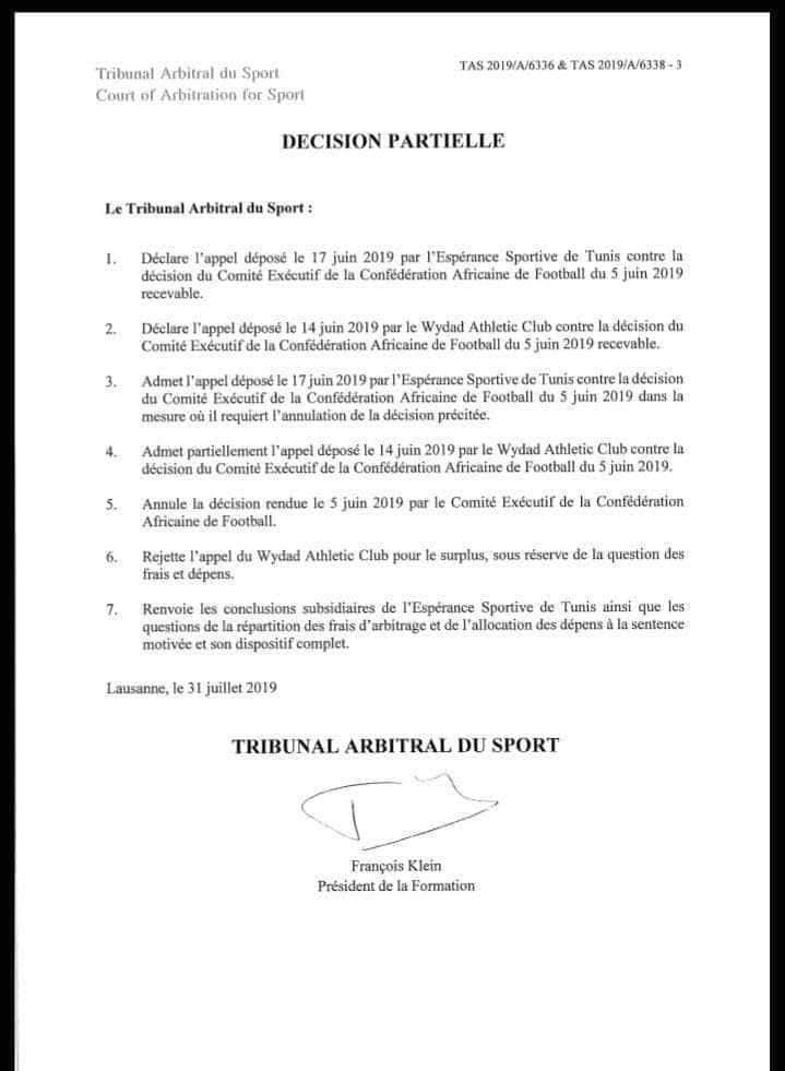 أصدرت محكمة التحكيم الرياضي “تاس” منذ قليل قرارها بخصوص ملف مباراة نهائي دوري أبطال إفريقيا و التي جمعت بين الترجي التونسي والوداد البيضاوي المغربي.