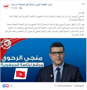 وورد بالصفحة الرسمية لحزب الطليعة العربي الديمقراطي في صفحته على الفايسبوك: “يقوم الان الرفيق منجي الرحوي بإيداع ملف ترشحه لرئاسة الجمهورية عن الجبهة الشعبية صحبة الرفيق خير الدين الصوابني الامين العام لحزب الطليعة العربي الديمقراطي والرفيق زياد لخضر الامين العام لحزب الديمقراطيين الموحد، وكان الرفيق المنجي الرحوي أول المتقدمين بملف الترشح مكتمل الشروط