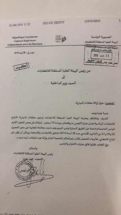 و راسلت الهيئة وزارة الداخلية ، موضحة أن المعلقات الاشهارية تعد مخالفة انتخابية على معنى الفصول 52 و 54 و 57 من القانون الاساسي عدد 16 لسنة 2014 المتعلق بالانتخابات و الاستفتاء ، و ذلك على بعض محاور مداخل تونس العاصمة و خاصة الطريق السريعة تونس المرسى ، مشيرة الى ما من شأنه أن يؤثر على المناخ الانتخابي .