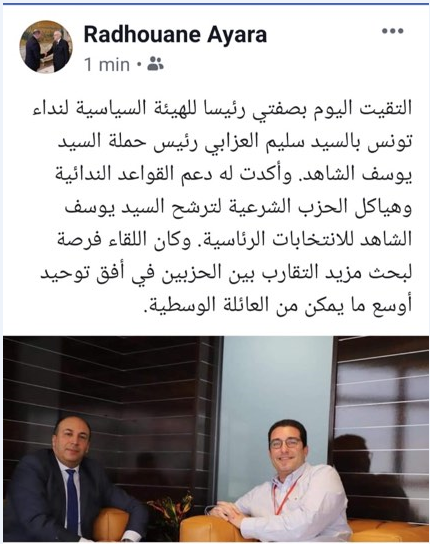 و نشر عيارة جمع منذ قليلعلى صفحته على الفايسبوك صورة من لقاء جمعه بسليم العزابي أمين عام حركة تحيا تونس ورئيس حملة الشاهد.