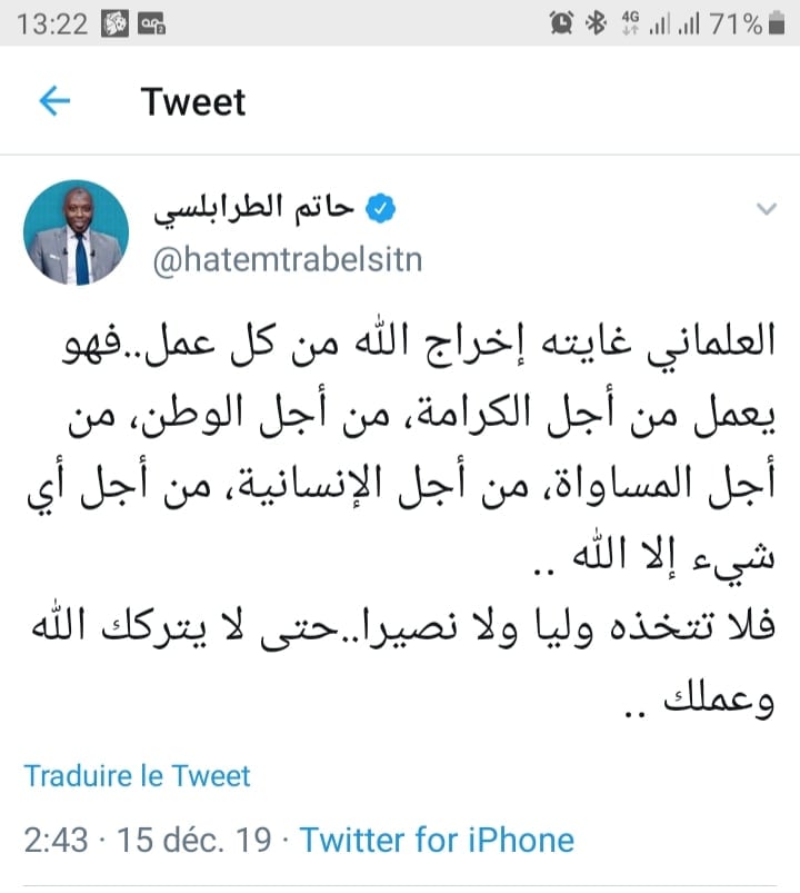 ونشر المحلل الرياضي القريب من تنظيم الاخوان، تغربدة على صفحته الخاصة بموقع تويتر، مفادها أن، “العلماني غايته اخراج الله من كل عمل، فهو يعمل من أجل الكرامة من أجل الوطن من أجل المساواة من أجل الإنسانية، من أجل أي شيء إلا الله”، داعيا إلى عدم اتخاذ العلماني، وليا ولا نصيرا، حتى لا يتركك الله في عملك، حسب اعتقاده.