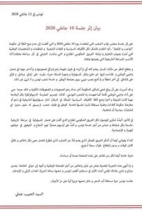 أصدر الحبيب الجملي اليوم الأحد 12 جانفي 2020 بيانا للرأي العام، تقدم فيه بالشكر لكل من آمن بصواب إختياره، وللفريق الحكومي الذي وافق على تحمل المسؤولية، ومعلنا عودته إلى حياته الخاصة بعد إنهاء التجربة التي وصفها ”بالمضنية”..