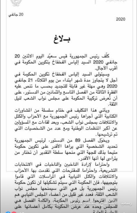 أعلنت رئاسة الجمهورية مساء اليوم الاثنين 20 جانفي 2020 ان الرئيس قيس سعيد قرر تكليف الياس الفخفاخ ، بتشكيل الحكومة مذكرة بان الفصل 89 من الدستور يمنحه شهرا غير قابل للتجديد لتشكيل الحكومة.