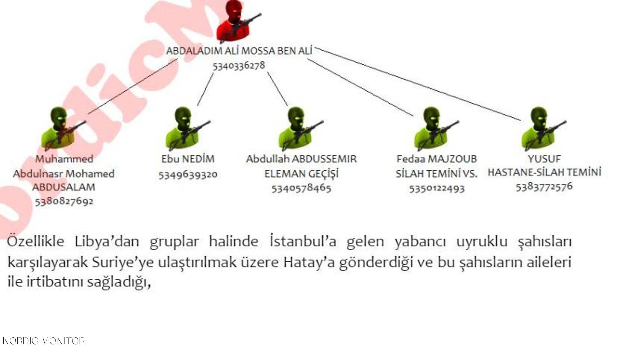 وذكرت الوثائق التي حصل عليها موقع “نورديك مونيتور”، أن ما يعرف بتنظيم “بن علي”، الذي يقوده الليبي المتشدد عبد العظيم علي موسى بن علي، القريب من تنظيم القاعدة، شارك في نقل المسلحين والأسلحة من ليبيا إلى سوريا، عبر تركيا.