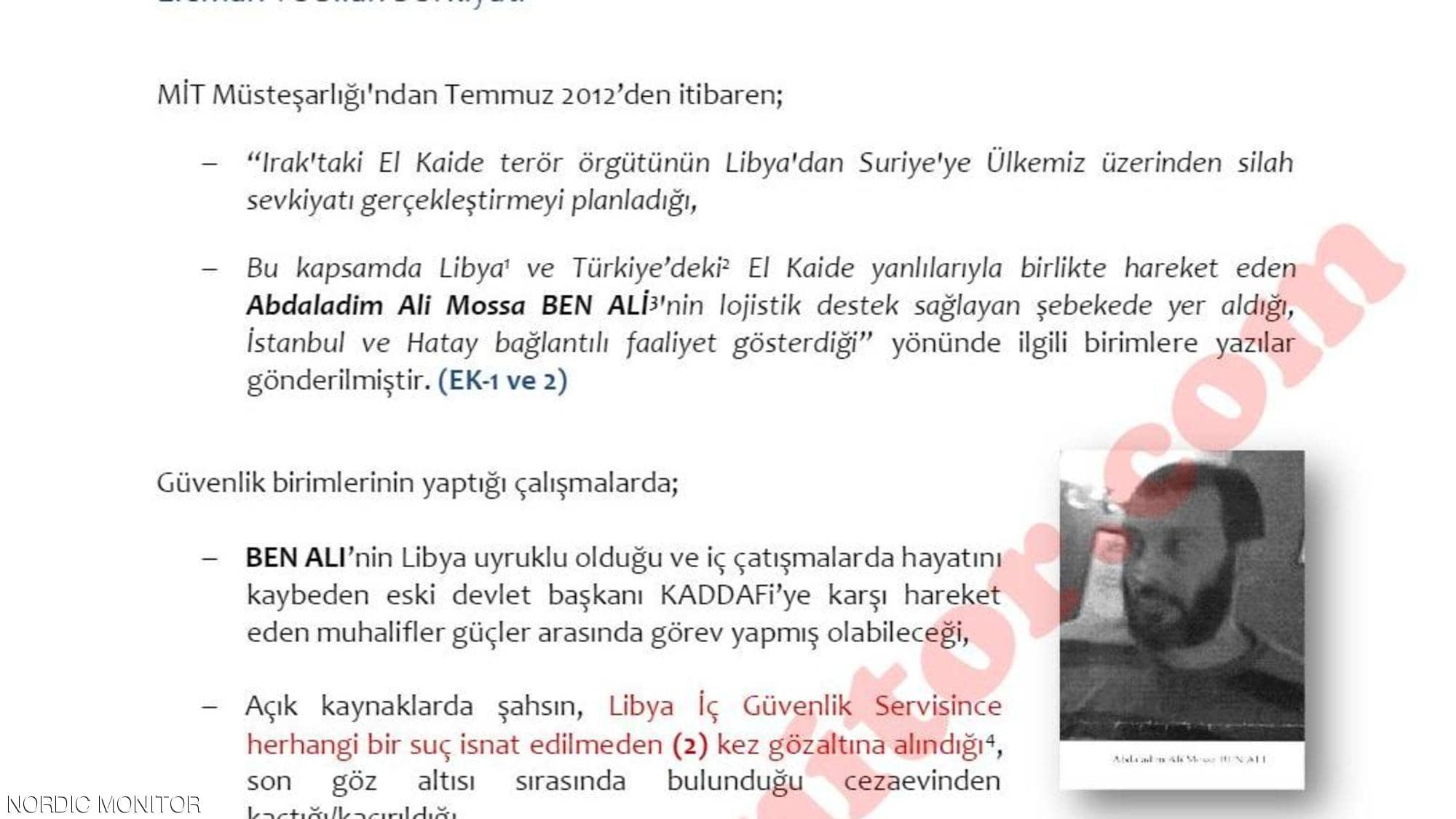 وذكرت الوثائق التي حصل عليها موقع “نورديك مونيتور”، أن ما يعرف بتنظيم “بن علي”، الذي يقوده الليبي المتشدد عبد العظيم علي موسى بن علي، القريب من تنظيم القاعدة، شارك في نقل المسلحين والأسلحة من ليبيا إلى سوريا، عبر تركيا.