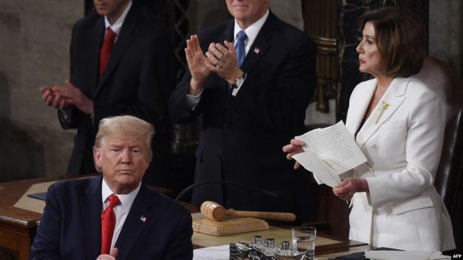 عقب انتهاء الرئيس الأميركي دونالد ترامب من إلقاء خطابه السنوي عن “حالة الاتحاد”، مساء الثلاثاء، أقدمت رئيسة مجلس النواب نانسي بيلوسي، في خطوة غير بروتوكولية، على تمزيق مجموعة من الأوراق بدت وكأنها نسخة من الخطاب، ما يُظهر إلى حدّ كبير غياب التوافق بينهما.