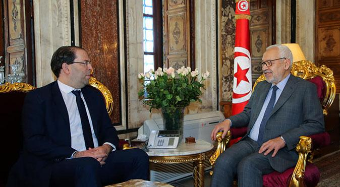 استقبل، الیوم الاثنین، راشد الغنوشي رئیس مجلس نواب الشعب يوسف الشاھد رئیس الحكومة، بقصر باردو.