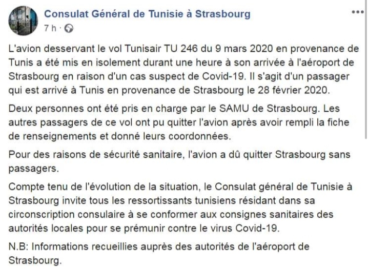 أعلنت القنصليّة التونسية في ستراسبورغ في بلاغ أنّه تم عزل طائرة الخطوط التونسية غادرت تونس أمس 9 مارس 2020 مطار قرطاج لمدّة ساعة فور وصولها الى مطار ستراسبورغ، بعد التأكد من وجود حالة مصابة بفيروس ”كورونا” على متن الرحلة.