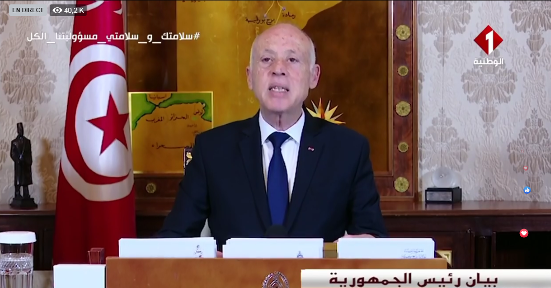 أعلن الرئيس قيس سعيّد حظر الجولان بداية من يوم غد الأربعاء من الساعة السادسة مساء إلى السادسة صباحا، وأوضح في خطاب متلفز إلى أنه تم اصدار الأمر إلى القوات المسلحة والوحدات الأمنية للقيام بدوريات مشتركة في كامل تراب الجمهورية.