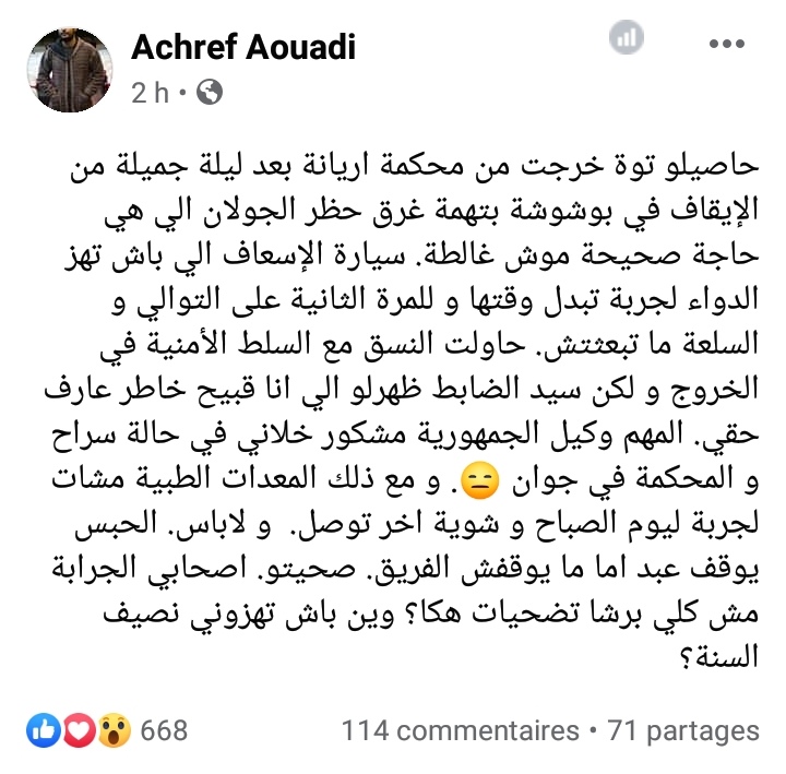 وكتب العوادي في تدوينة له أنه كان بصدد ارسال أدوية إلى جربة، وقد تم الابقاء عليه في حالة سراح في إنتظار محاكمته.