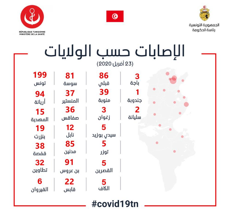 أعلنت وزارة الصحة ، أن العدد الجملي للمصابين بفيروس كورونا بتاريخ 23 أفريل 2020 ، بلغ 922 حالة مؤكدة من بين 19849 تحليلا إجماليا، تماثل منهم 190 مصابا للشفاء، وتوفي 38 شخصا.