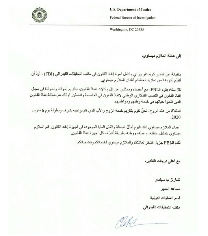 مكتب التحقيقات الفدرالي الFBI يوجه رسالة امتنان الى عائلة الشهيد الملازم ميساوي
