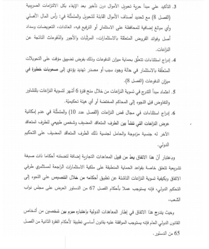 وباعتبار أن هذا الاتفاق يعد من قبيل المعاهدات التجارية اضافة لتضمنه أحكاما ذات صبغة تشريعية تتعلق خاصة بقواعد الحماية المنطبقة على ملكية الاستثمارات الراجعة لمستثمري طرفي الاتفاق وبكيفية تسوية النزاعات الناشئة عن تطبيق أحكامه من خلال التنصيص على اللجوء الى التحكيم الدولي فانه يستوجب عملا بأحكام الفصل 67 من الدستور العرض على مجلس نواب الشعب.