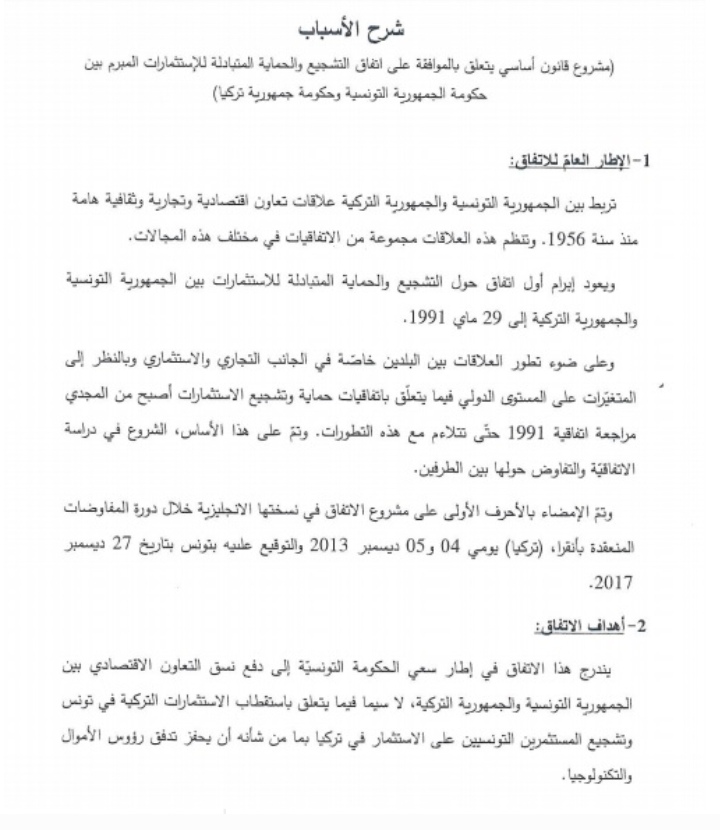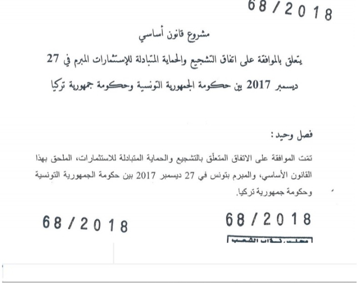 ومن مشاريع القوانين التي سينظر فيها مشروع قانون أساسي عدد 68/2018 يتعلق بالموافقة على اتفاق التشجيع والحماية المتبادلة للإستثمارات المبرم في 27 ديسمبر 2017 بين حكومة الجمهورية التونسية وحكومة جمهورية تركيا.