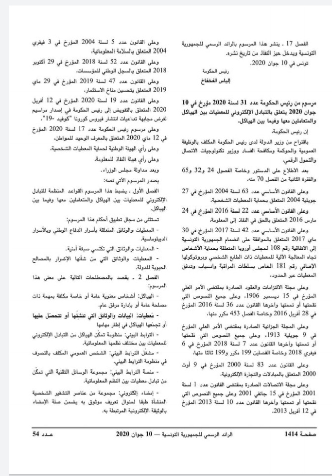 غير مصنف صدور مرسوم حكومي حول التبادل الإلكتروني للمعطيات By halketwassl On يونيو 11, 2020 215 حلقة وصل _ فريق التحرير صدر مرسوم من رئيس الحكومة عدد 31 لسنة 2020 مؤرخ في 10 جوان 2020 يتعلق بالتبادل الإلكتروني للمعطيات بين الهياكل و المتعاملين معها و فيما بين الهياكل. وفي التالي فحوى المرسوم: 215 Share FacebookTwitterGoogle+ReddItWhatsAppPinterestالبريد الإلكتروني