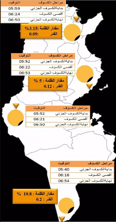 و يكون الكسوف في تونس جزئيا ويمكن متابعته في كامل أنحاء البلاد كما يبينه الجدول الموالي. أما بخصوص مدينة تونس فيمكن مشاهدة الكسوف الجزئي بداية من الساعة الخامسة صباحا و59 دقيقة إلى غاية الساعة السادسة و50 دقيقة مع نسبة مساحة مغطاة من قرص الشمس 9 %.