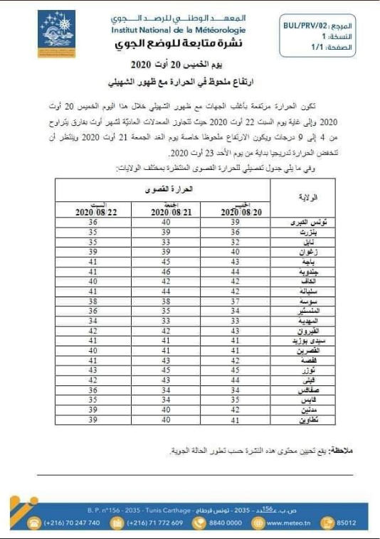 وتتجاوز درجات الحرارة المعدلات العادية لشهر أوت بفارق يتراوح من 4 الى 9 درجات ويكون الارتفاع ملحوظا خاصة يوم الغد الجمعة 21 أوت 2020، وينتظر أن تنخفض درجات الحرارة تدريجيا بداية من يوم الاحد 23 أوت 2020، وفق ذات البلاغ.