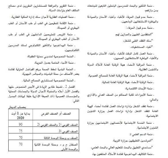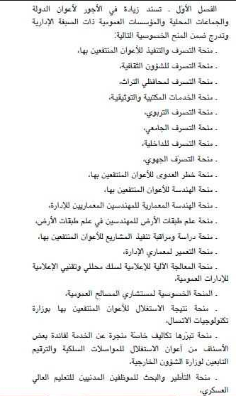 تسند الزيادة في الأجور لأعوان الدولة والجماعات المحلية والمؤسسات العمومية ذات الصبغة الإدارية وتدرج ضمن المنح الخصوصية وفقا للفصل الأول من الأمر الحكومي وضبط الفصل الثاني في جدول نسبة الزيادة بالدينار.