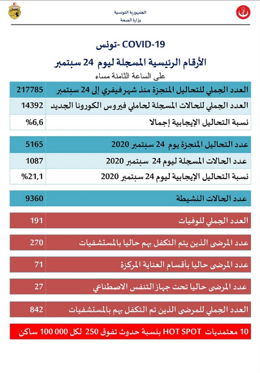 أعلنت وزارة الصحة في بلاغ لها أنه تم يوم 24 سبتمبر 2020 تسجيل 1087 إصابة جديدة بفيروس كورونا ليرتفع بذلك العدد الجملي للإصابات منذ انتشار الوباء إلى 14392 إصابة.