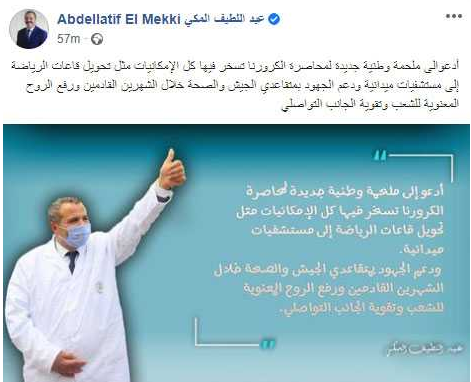 دعا وزير الصحة السابق عبد اللطيف المكي ، في تدوينة نشرها على صحفته بالفايسبوك اليوم الخميس 8 أكتوبر 2020، الى ” ملحمة وطنية جديدة لمحاصرة الكرورنا ” .
