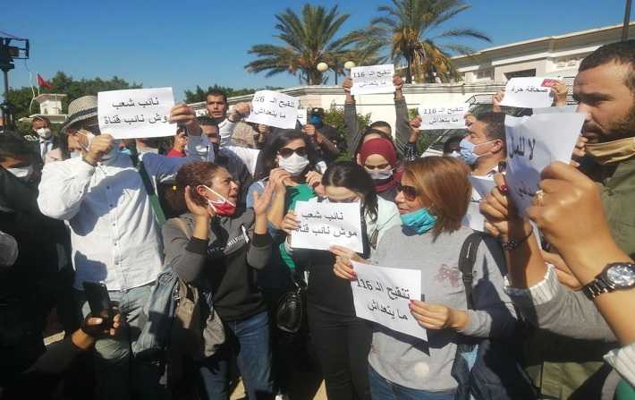 نفّذ صباح اليوم الثلاثاء 20 أكتوبر 2020، الصحفيين التونسيين وقفة احتجاجية أمام البرلمان  للتصدي لمشروع تنقيح المرسوم 116، رافعين شعارات ”تنقيح 116 ما يتعداش”، ”لن يمر لن يمر والإعلام في خطر”، ”حريات صحفية لا إرهاب ولا رجعية”، ”لا للمال السياسي”.