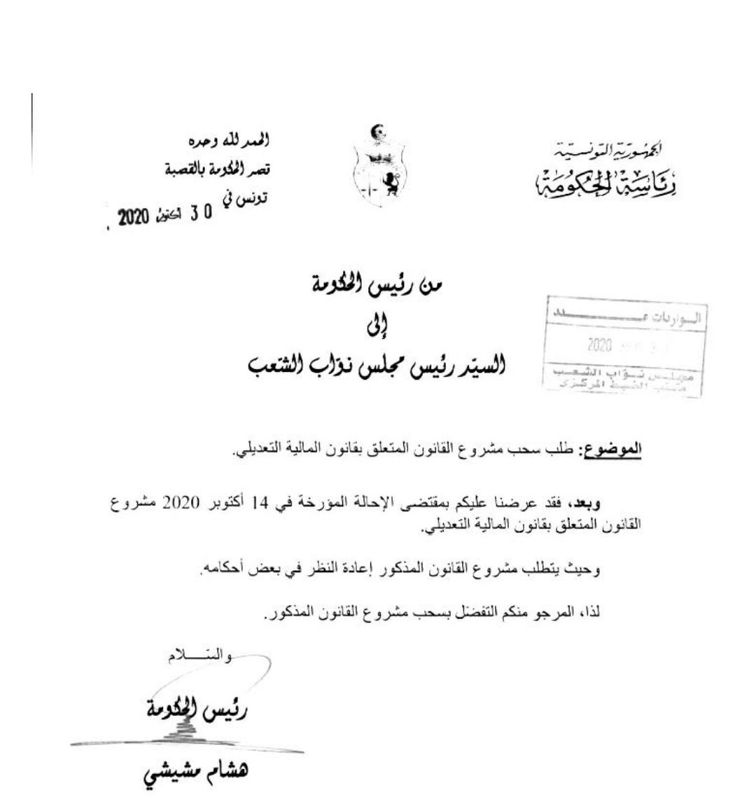 تلّقى مجلس نواب الشعب بتاربخ 30 أكتوبر مراسلة من رئيس الحكومة هشام المشيشي تتعلق بسحب مشروع قانون المالية التعديلي لسنة 2020 والذي تم إيداعه المجلس يوم 14 أكتوبر.