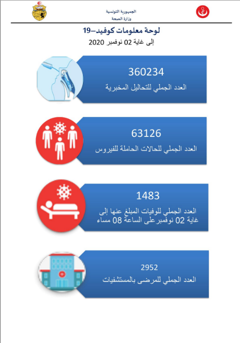 أعلنت وزارة الصحة في بلاغ لها منذ قليل عن الأرقام الرئيسيّة المسجّلة يوم 2 نوفمبر 2020 حيث تم تسجيل 1220 إصابة جديدة بفيروس كورونا من جملة 3508 تحاليل منجزة، فيما بلغ عدد الوفيات 25 حالة لليوم ذاته.