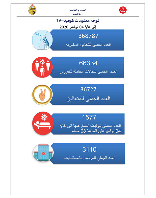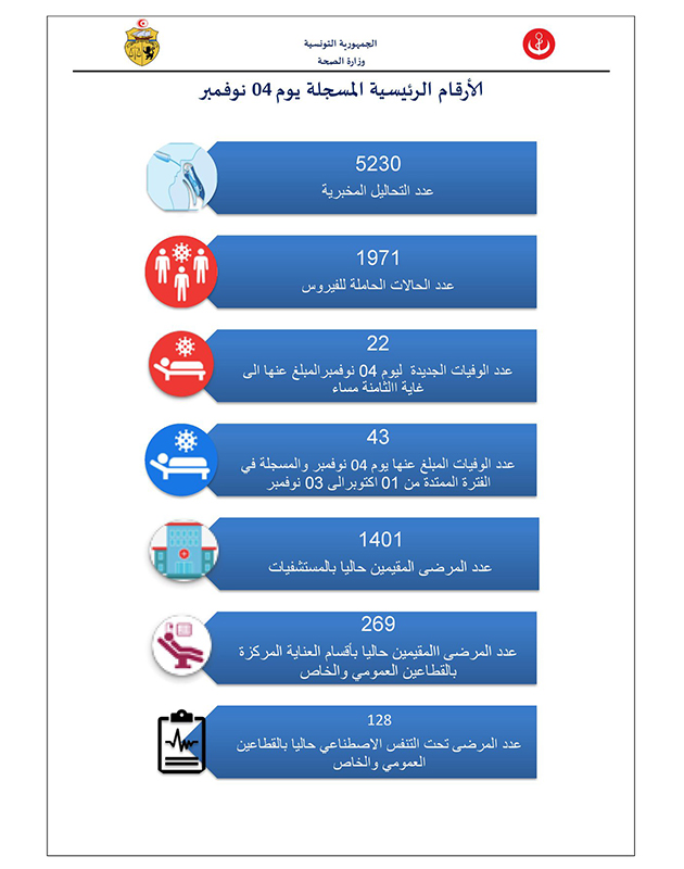 كما تم تسجيل 22 حالة وفاة بالفيروس يوم 4 نوفمبر في ما بلغ عدد المرضى المقيمين بأقسام العناية المركزة بالقطاعين العمومي و الخاص 269 حالة.
