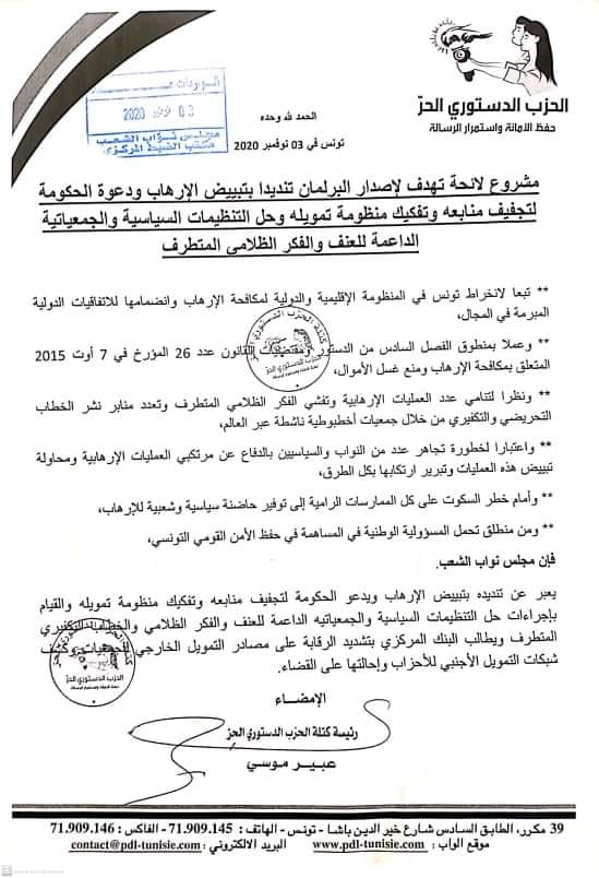 وتتضمن اللائحة دعوة البرلمان للتنديد بتبييض الإرهاب وتفكيك منظومة تمويله وحلّ التنظيمات السياسية والجمعياتية الداعمة للعنف والفكر المتطرف.