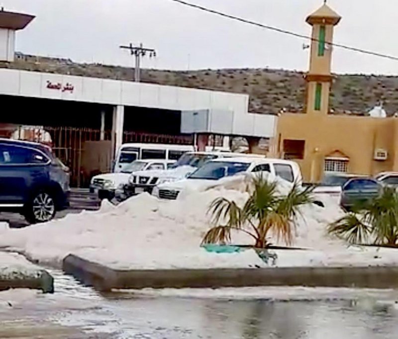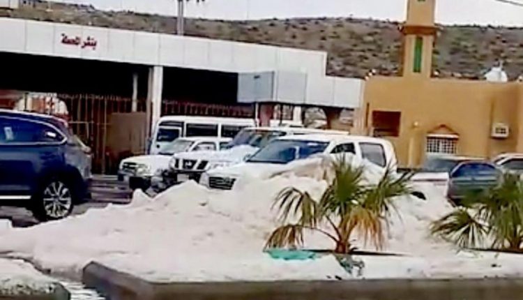 في حدث نادر وغیر مسبوق.. الثلوج تتساقط على منطقة في السعودیة