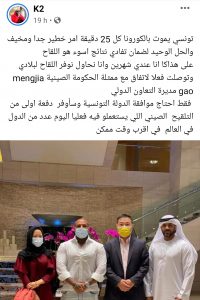 نفت السفارة الصينية بتونس، في بلاغ لها اليوم 12 ديسمبر 2021، ما صرّح به المغني “كادوريم” بخصوص توصله إلى اتفاق مع ممثلة الحكومة الصينية Mengjia Gao مديرة التعاون الدولي لتوفير الدفعة الأولى من التلقيح الصيني ضدّ فيروس كورونا.