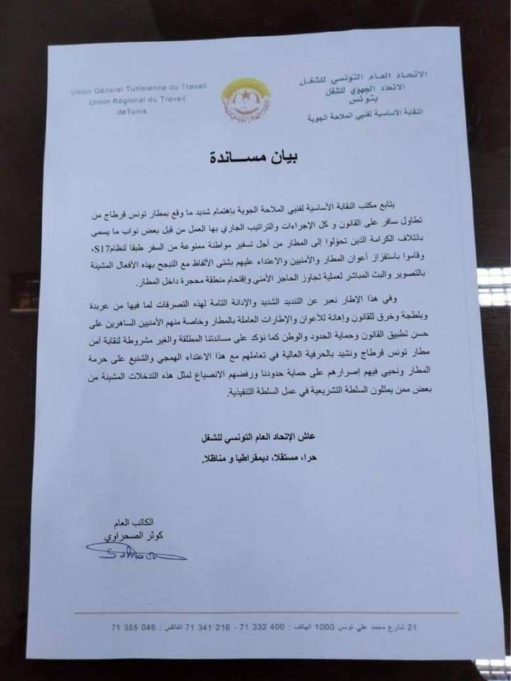 و أكدت النقابة مساندتها المطلقة و الغير مشروطة لنقابة أمن مطار تونس قرطاج و تشيد بالحرية العالية لتعاملهممع هذا ” الاعتداء الهمجي و الشنيع” .