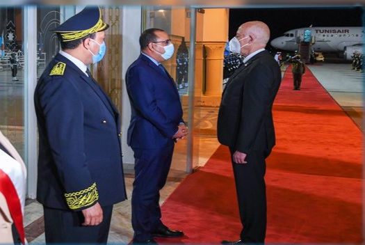 وكان في استقباله لدى حلوله بالمطار كل من رئيس الحكومة، هشام مشيشي والوزيرة مديرة الديوان الرئاسي، نادية عكاشة ووالي تونس، الشادي بوعلاق ورئيسة بلدية تونس، سعاد عبد الرحيم وعدد من أعضاء الديوان الرئاسي.