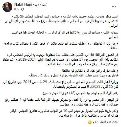 وأكد نبيل حجي في تدوينة له علة صفحته على الفايسبوك ، وجود 17 مطلب رفع حصانة في المدة النيابية 2014-2019 ومطلب رفع حصانة وحيد في المدة النيابية الحالية.