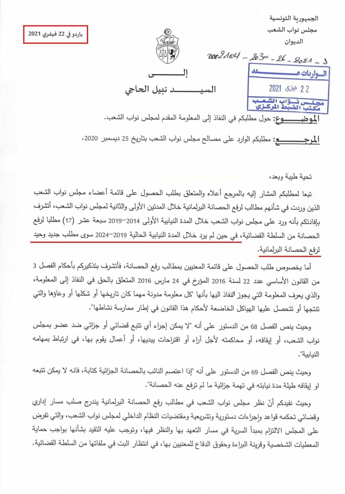 ونشر نبيل حجي الرد الكتابي الذي تحصّل عليه بتاريخ 22 فيفري 2021، من قبل إدارة البرلمان بعد أن كان قد قدّم مطلب نفاذ للمعلومة حول الحصول على قائمة النواب الذين وردت في شأنهم مطالب لرفع الحصانة البرلمانية خلال المدّة النيابية الأولى والثانية.