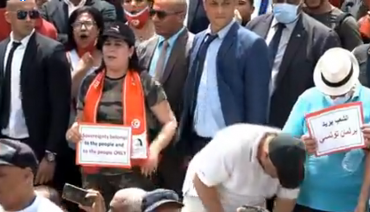 واقتحمت رئيسة الحزب الدستوري الحر عبير موسي الحاجز البشري الأمني ودخلت الساحة.