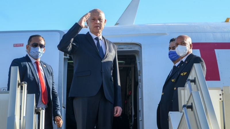 وكان في توديع رئيس الجمهورية بالمطار رئيس الحكومة هشام مشيشي، ووالي تونس الشادلي بوعلاق، ورئيسة بلدية تونس سعاد عبد الرحيم وعدد من أعضاء الديوان الرئاسي.
