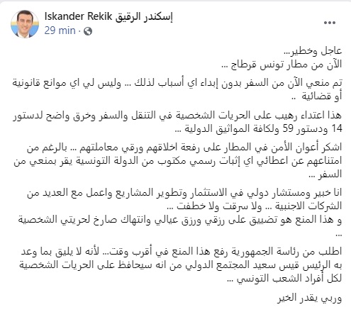 قال الناشط السياسي، اسكندر الرقيق، إنه تم صباح اليوم بمطار قرطاج الدولي، منعه من السفر دون تقديم أي سبب.