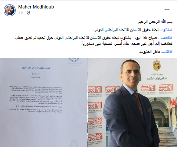سياسة ماهر مذيوب يشتكي إلى الاتحاد البرلماني الدولي حول تجميده By halketwassl On سبتمبر 3, 2021 119 حلقة وصل _ فريق التحرير اكّد النائب المجمد بمجلس نواب الشعب ماهر مذيوب في تدوينة على صفحته بالفاسبوك ، أنه تقدم صباح اليوم بشكوى للجنة حقوق الإنسان للاتحاد البرلماني الدولي حول تجميد ثم تعليق عمله كمنتخب إلى أجل غير مسمى على أسس وصفها بالتعسفية و غير الدستورية. 119 Share FacebookTwitterGoogle+ReddItWhatsAppPinterestالبريد الإلكتروني