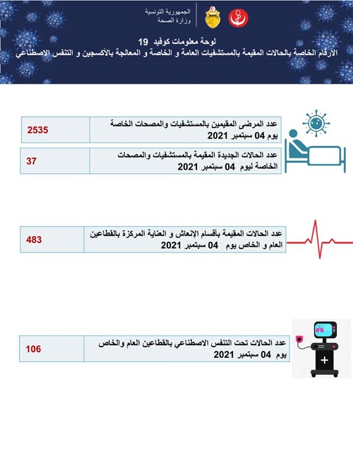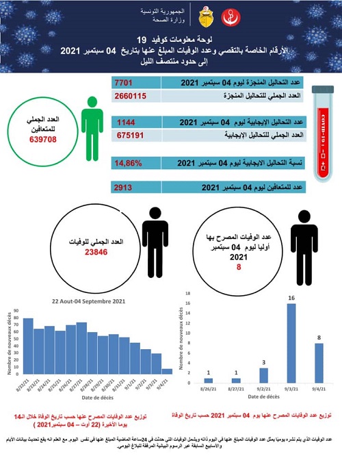 أفادت وزارة الصحة بأن عدد الوفيات بفيروس كورونا المصرّح بها بتاريخ 4 سبتمبر الحالي، بلغ 8 وفيات، في حين بلغ عدد الإصابات الجديدة بالفيروس 1144 إصابة.