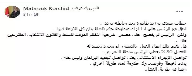 وأضاف كرشيد أن “الرئيس لم يفصح عن مصدر شرعية النظام المؤقت للسلط والقانون الانتخابي المقترحين منه”، متسائلا إن كان ذلك يعني ” إنهاء العمل بالدستور أم مجرد تجميد له؟”.