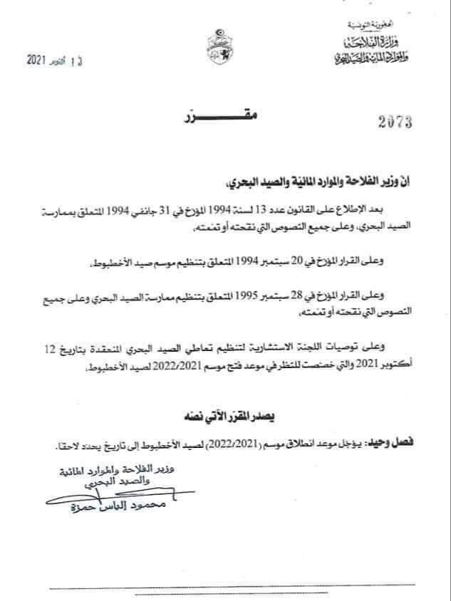 متابعات وزارة الفلاحة : تأجيل موعد انطلاق موسم صيد الأخطبوط By halketwassl On أكتوبر 14, 2021 742 حلقة وصل _ فريق التحرير أصدر وزير الفلاحة والموارد المائية والصيد البحري محمود الياس حمزة مقررا أمس الأربعاء يقضي بتأجيل موعد إنطلاق موسم 2021 -2022 لصيد الأخطبوط إلى تاريخ يحدد لاحقا. 742 Share FacebookTwitterGoogle+ReddItWhatsAppPinterestالبريد الإلكتروني