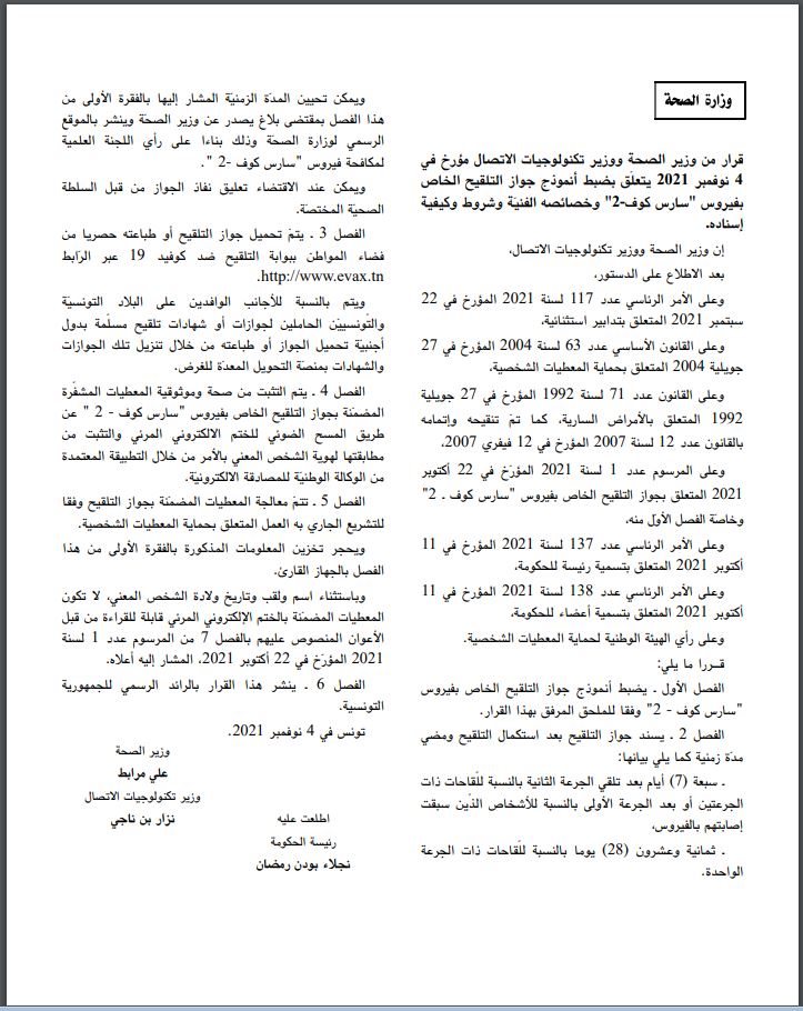 تضمّن الرائد الرسمي للجمهورية التونسية اليوم 5 نوفمبر 2021 قرارا من وزير الصحة ووزير تكنولوجيات الاتصال مؤرخ في 4 نوفمبر 2021 يتعلّق بضبط أنموذج جواز التلقيح الخاص بفيروس “سارس كوف-2 ” وخصائصه الفنية وشروط وكيفية إسناده.