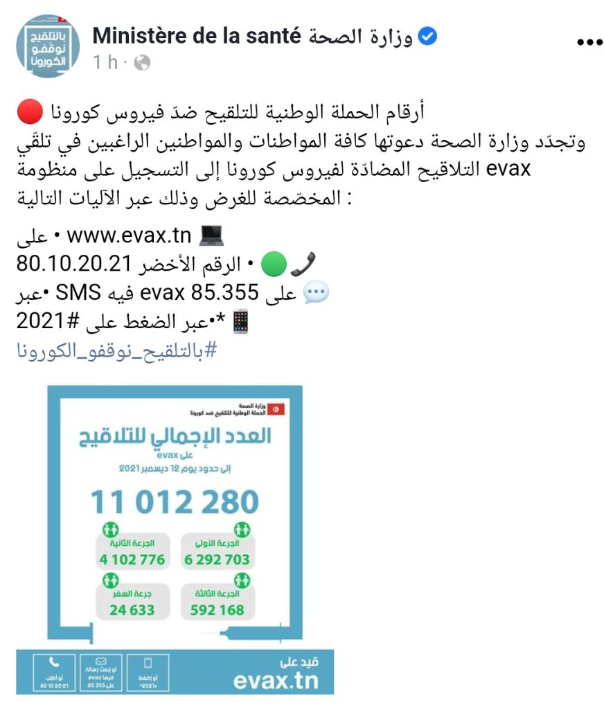 وجدّدت وزارة الصحة دعوتها كافة المواطنات والمواطنين الراغبين في تلقّي التلاقيح المضادّة لفيروس كورونا.