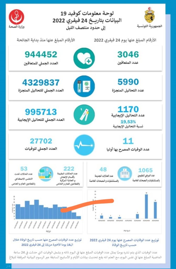 أفادت وزارة الصحة بأن عدد الوفيات المُبلّغ عنها بتاريخ 24 فيفري الحالي، بلغ 11 حالة وفاة مع تسجيل 1170 إصابة جديدة.وارتفع بذلك العدد الجملي للوفيات بالفيروس، منذ بداية انتشار الوباء، إلى 27702 حالة وفاة والإصابات إلى 995713 إصابة.